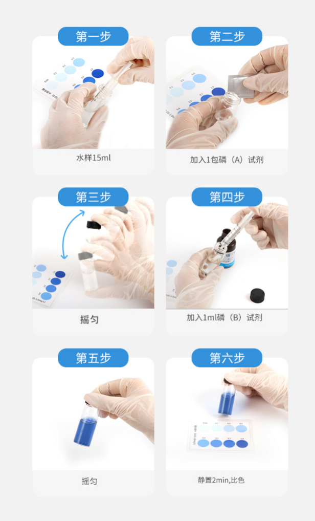 1、取預(yù)處理后水樣15mL,加入到測(cè)試瓶中 2、加入一包磷(A) 試劑,擰緊測(cè)試瓶蓋,搖勻溶解 3、加入1 mL磷(B)試劑,搖勻 4、靜置2分鐘,將測(cè)試瓶放在比色卡空白處,從上往下看,讀取顏色最接近的色階即為測(cè)試結(jié)果